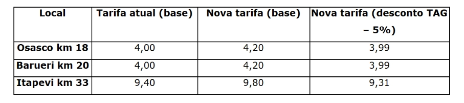 Confira na tabela abaixo os novos valores dos pedágios: